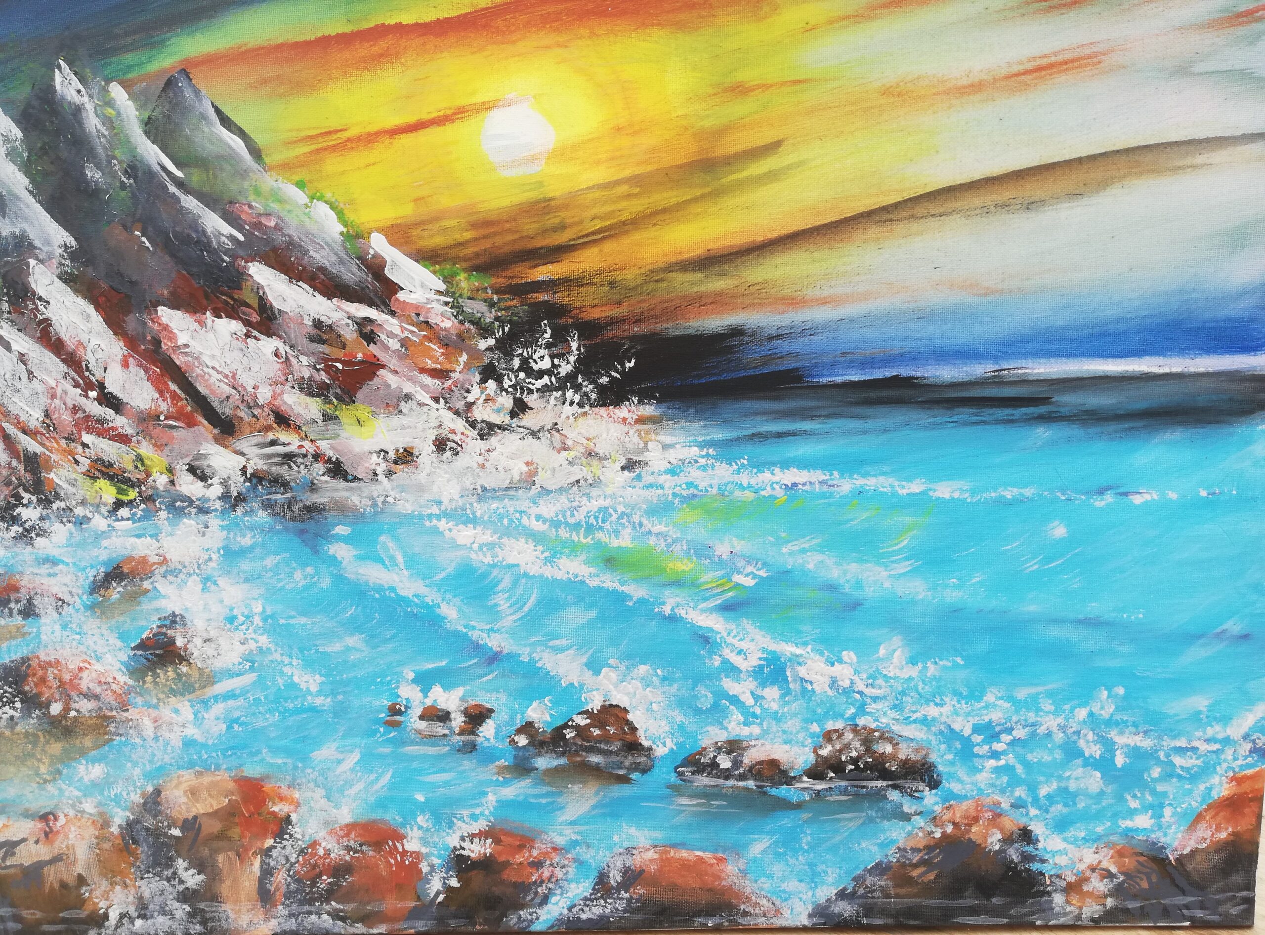 Auf einer Fläche von 80 x 50 cm entfaltet sich in Akryl auf Leinwand ein beeindruckendes maritimes Panorama. Heitmeier nutzt die besonderen Eigenschaften der Akrylfarben, um eine außergewöhnliche Tiefe und Brillanz zu erzeugen: