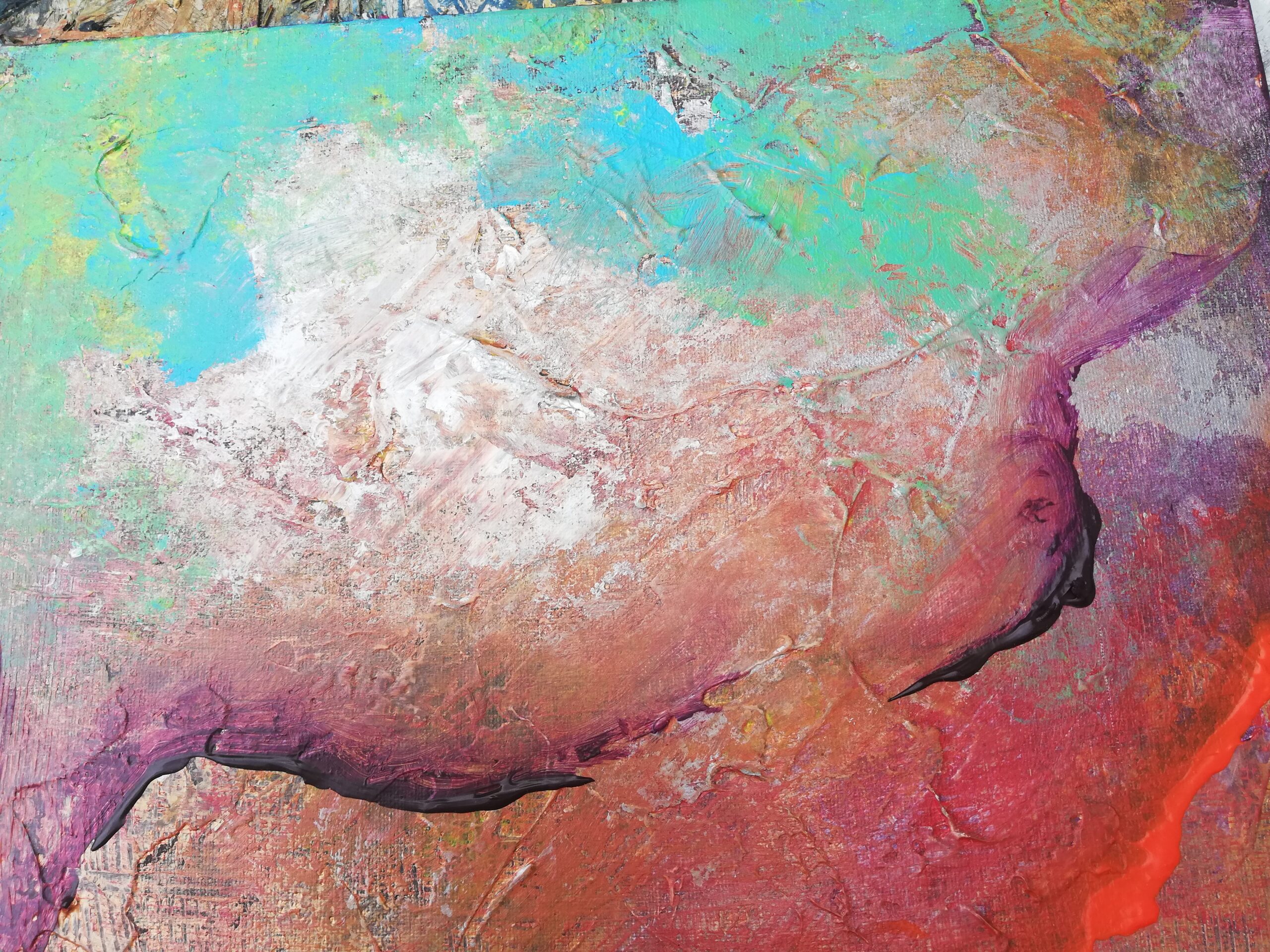 - Farbdominanz: Ein glühendes Rot-Spektrum verschmilzt mit erdigen Rosé- und Violetttönen, während im oberen Bereich kühles Türkis und frisches Grün einen spannungsgeladenen Kontrast bilden.