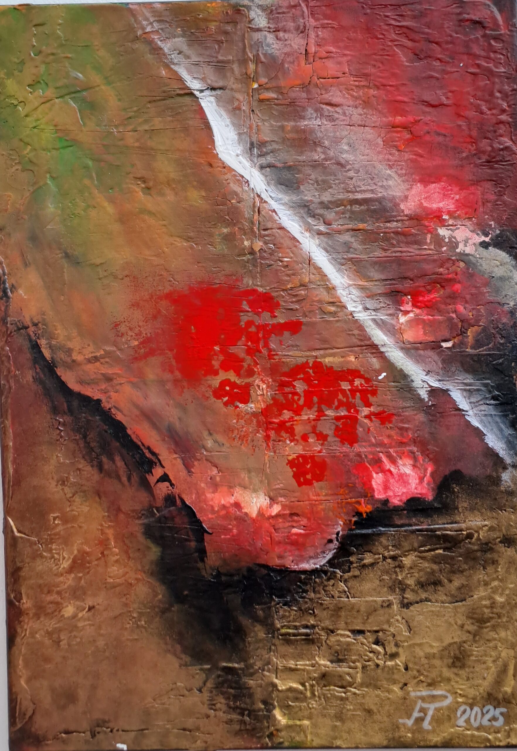Auf einem eleganten Format von 70 x 50 cm entfaltet sich ein dramatisches Spiel der Elemente. Heitmeier nutzt die Ölmalerei, um eine reliefartige, haptische Oberfläche zu schaffen, die das Licht im Raum einfängt und bricht. Ein leuchtender, weißer Energiestrahl schneidet diagonal durch das Bild und trennt kühle, erdige Ockertöne von tiefen, glühenden Rot- und Schwarztönen.