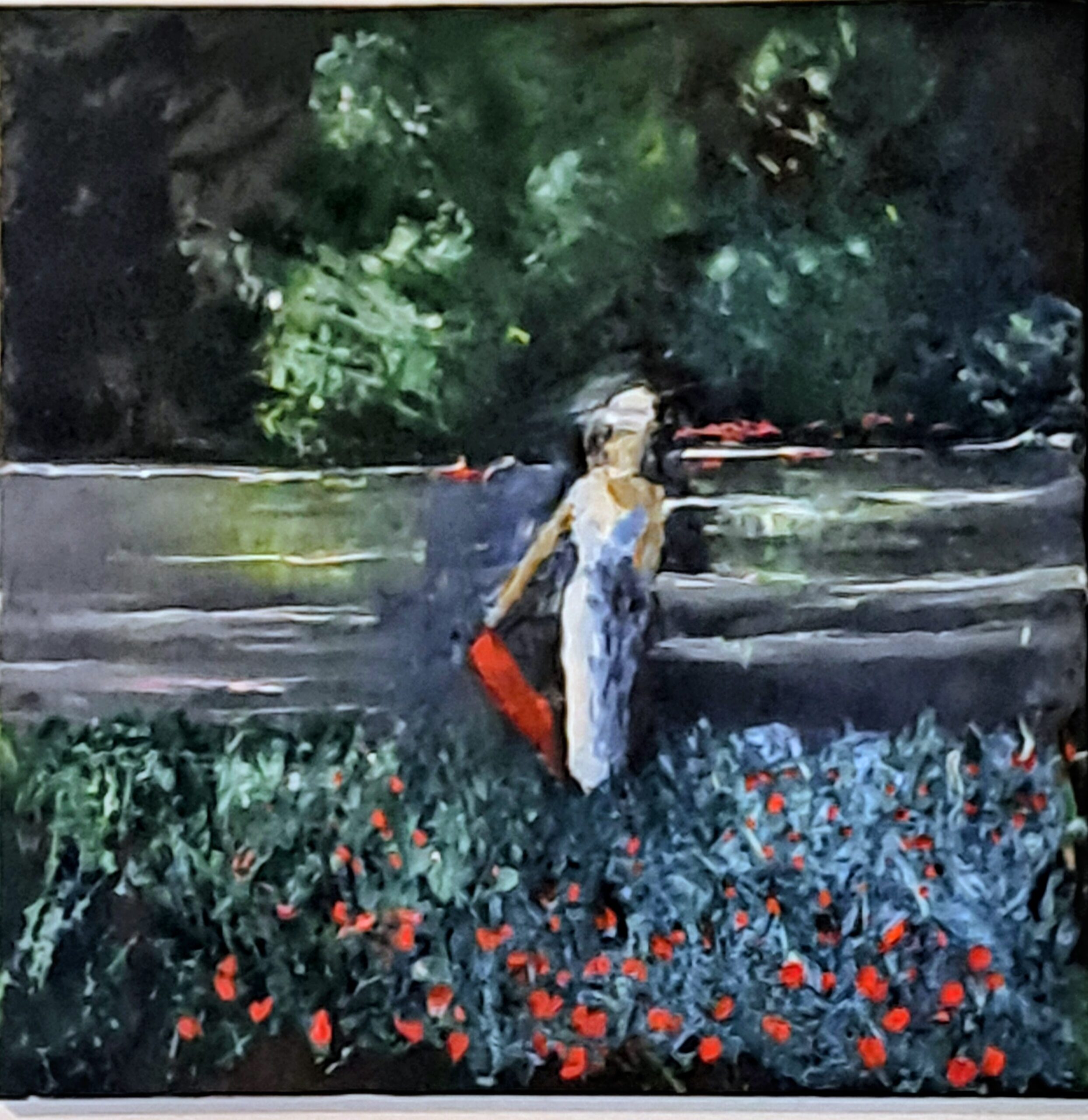 Besonders faszinierend ist der Vordergrund: Ein Meer aus dunklem Grün, durchsetzt mit leuchtend roten Akzenten – wie Mohnblumen oder späte Blüten, die im Halbdunkel glühen. Der pastose Farbauftrag verleiht der Vegetation eine lebendige Textur, während die weichen Übergänge im Bereich des Wassers und der Figur die typische Sanftheit hochwertiger Ölfarben widerspiegeln.