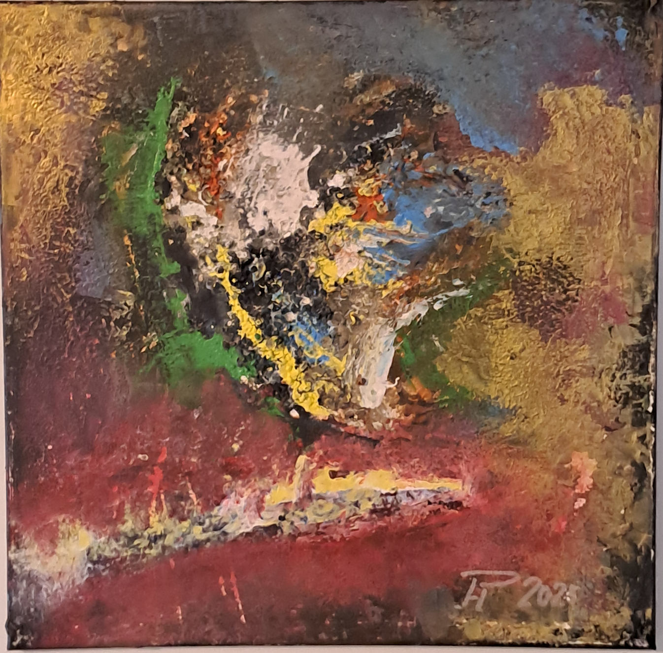 In dieser Komposition verarbeitet Heitmeier die Vielschichtigkeit unserer Epoche. Wilde, dunkle Nuancen und tiefrote Kontraste bilden das Fundament des „Chaos“, während leuchtende Gelb-, Blau- und Grüntöne im Zentrum wie ein Hoffnungsschimmer aufblitzen. Die dicken, gespachtelten Farbschichten verleihen dem Bild eine faszinierende Dreidimensionalität, die je nach Lichteinfall neue Details und Schattenwürfe offenbart.