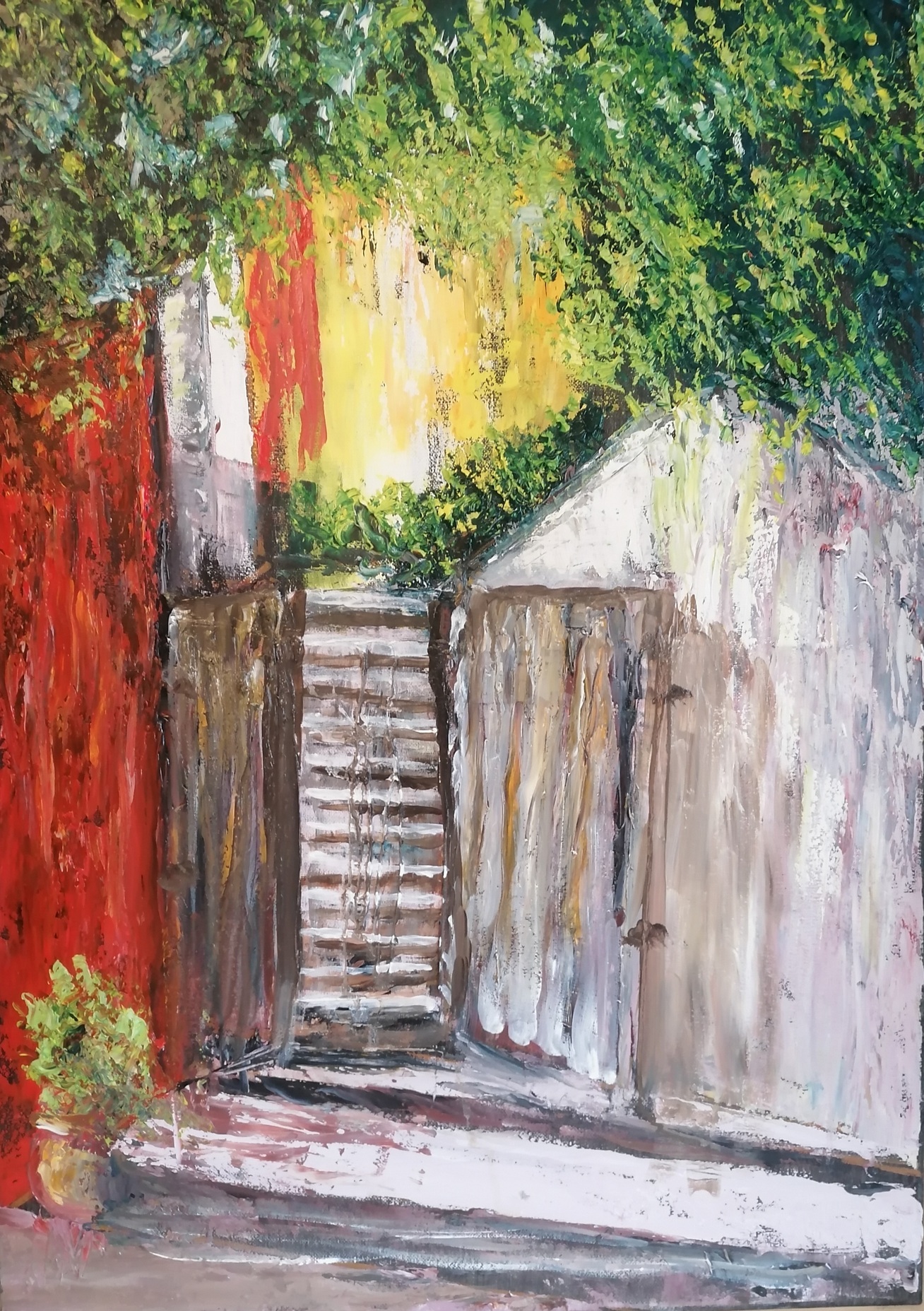 Mit meisterhaftem, pastosem Farbauftrag schafft Heitmeier eine Textur, die die Architektur fast greifbar macht. Das Spiel zwischen dem kräftigen, leidenschaftlichen Rot der linken Wand und dem sanften, kühlen Weiß des gegenüberliegenden Gebäudes erzeugt eine spannungsvolle Harmonie. Über allem thront ein dichtes Dach aus smaragdgrünem Laub, durch das die Mittagssonne in goldenen Reflexen bricht und die Treppenstufen in ein magisches Licht taucht.