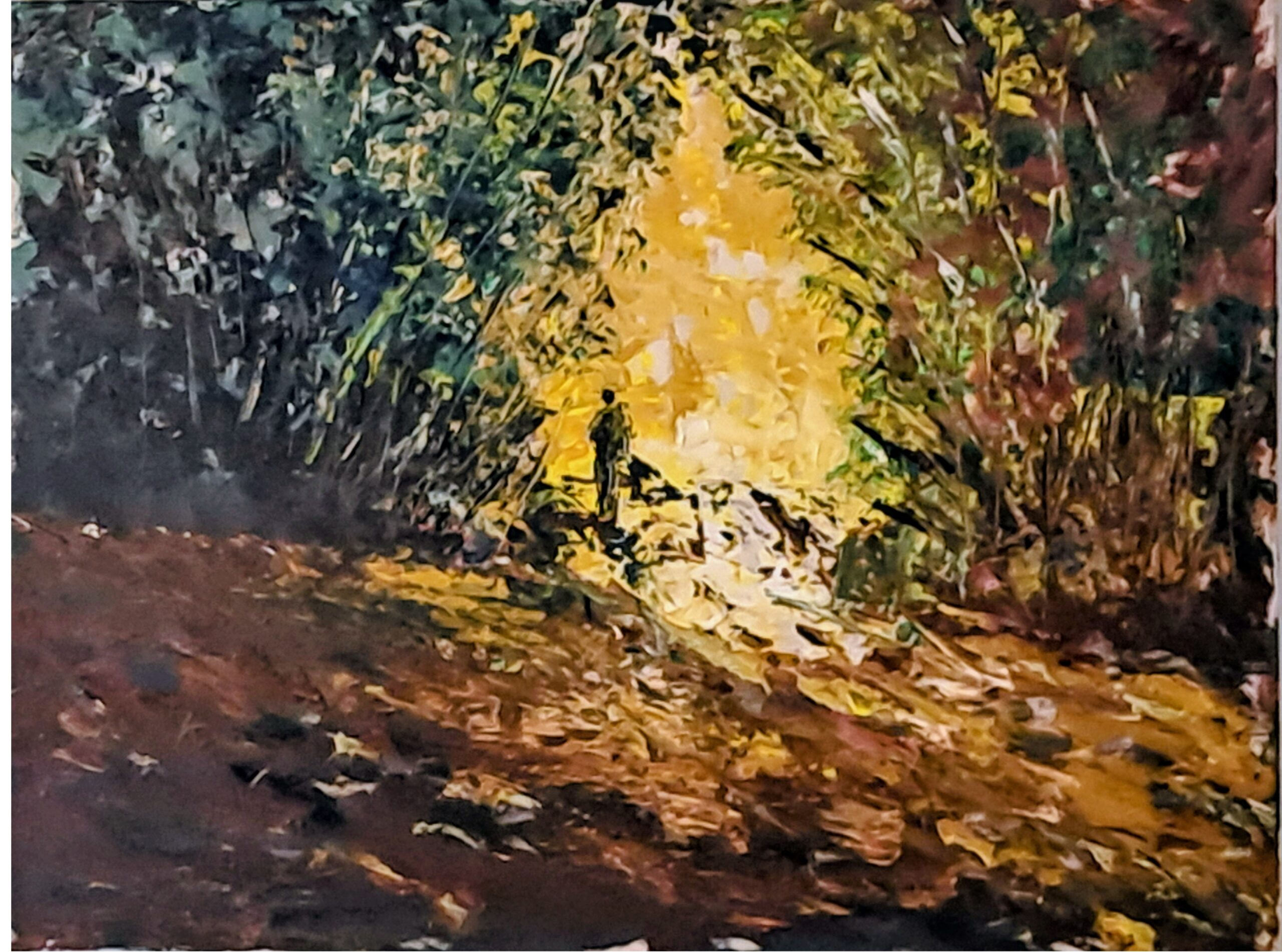 Besonders hervorzuheben ist die Lichtführung: Das warme Goldgelb und strahlende Weiß im Hintergrund bricht durch das dichte Blattwerk und erzeugt Reflexionen auf dem Waldboden, die dem Bild eine lebendige, fast sakrale Aura verleihen. Die groben Pinselstriche und der strukturierte Farbauftrag geben dem Werk eine moderne, expressionistische Note, die je nach Lichteinfall im Raum neue Details offenbart.